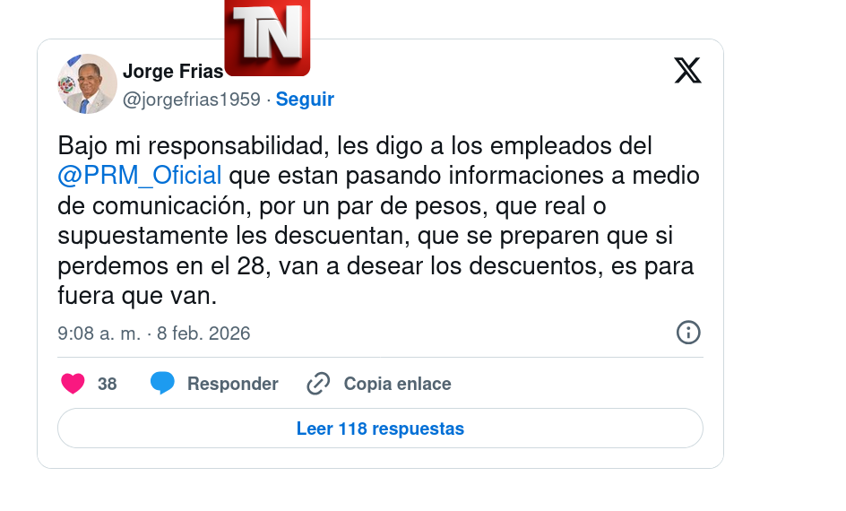 Santo Domingo, República Dominicana. El dirigente político y diputado del Partido Revolucionario Moderno (PRM), Jorge Frías, emitió una advertencia pública a empleados de esa organización que, según afirmó, estarían suministrando informaciones a medios de comunicación a cambio de dinero.