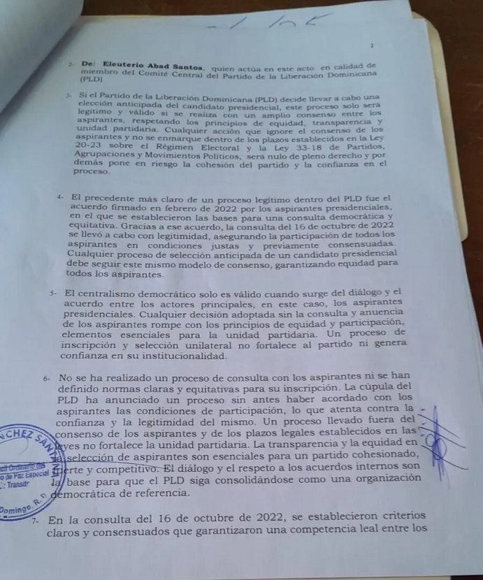 Santo Domingo, Distrito Nacional. – Eleuterio Abad Santos, miembro del Comité Central (CC) del Partido de la Liberación Dominicana (PLD), notificó formalmente al Comité Político (CP) sobre la ilegalidad y nulidad absoluta del proceso de selección de aspirantes aprobado en la reunión del pasado 3 de marzo de 2025.